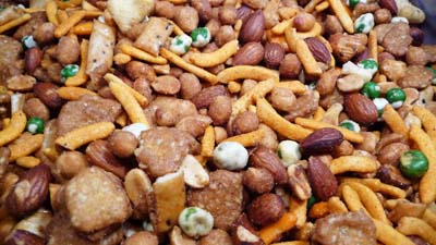 Honey Roasted Sesame Chips, Unbleached Wheat Flower, Soybean Oil, Sesame Seeds, Honey, Bulgur Wheat, Cajun Corn Sticks, Corn Masa, Rice Crackers, Maltodexatrin, Xanthon Gum, Potato Starch, Salt, Beet Powder, Tumeric, Wasabi Peas, Peanuts, Almonds