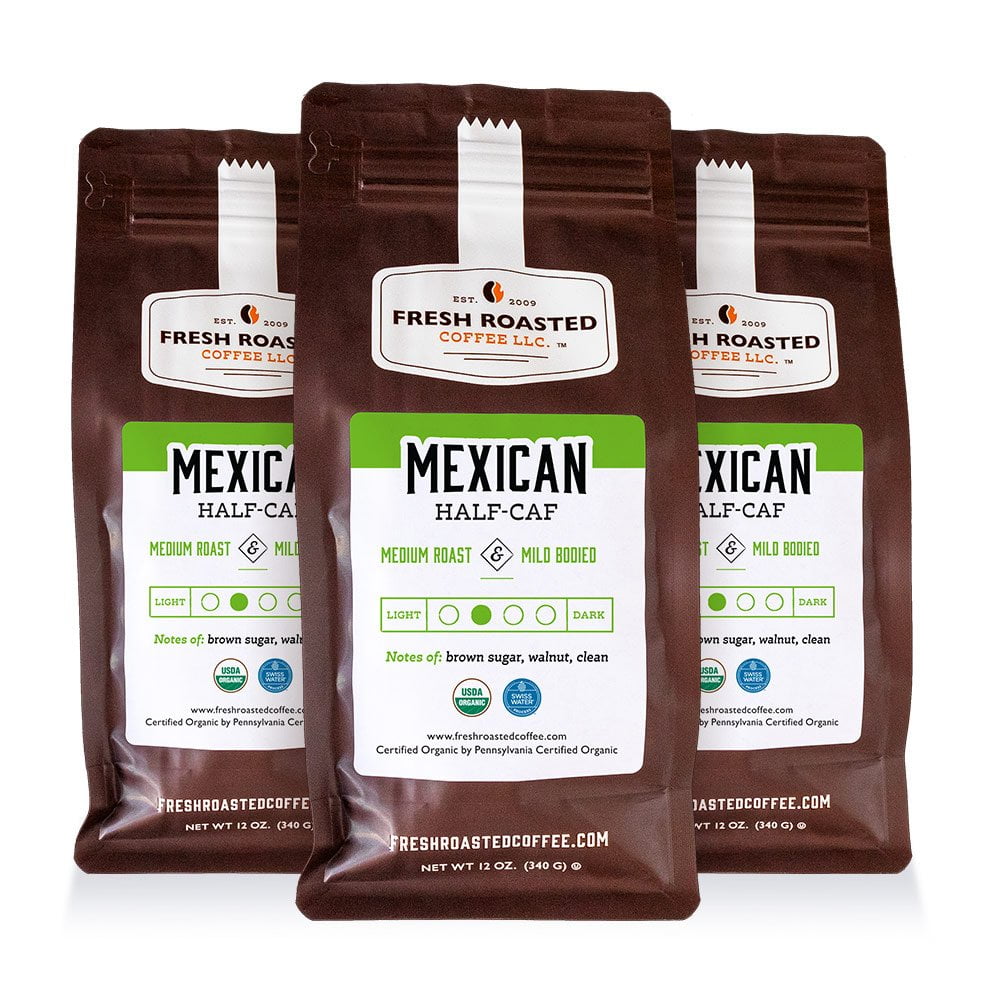 3 pack Fresh Roasted Coffee, Organic Mexican Swiss Water Half Caf Coffee, Medium Roast, Ground, 12 oz