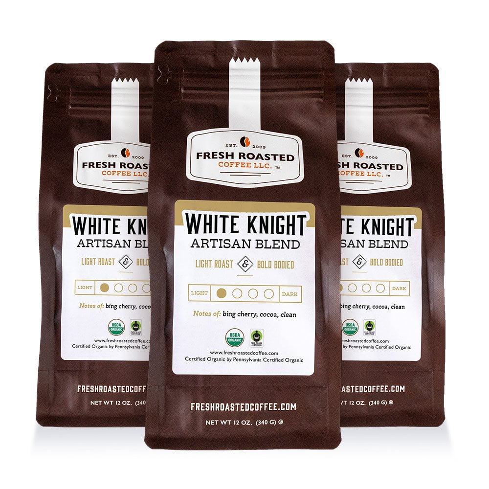 3 pack Fresh Roasted Coffee, Organic White Knight Blend Coffee, Light Roast, Ground, 12 oz