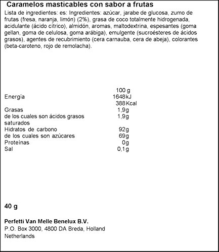 Sugar, Glucose Syrup, Coconut Oil Hydrogenated, Citric Acid, Manioc Strach, Flavors Natural & Artificial, Arabic Gum, Carnauba Wax, Gellan Gum, Sucrose Esters Of Fatty Acids, Colors Added
