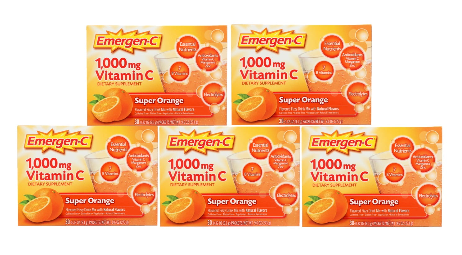 5 Pack | Emergen-C Dietary Supplement Drink Mix with 1000 mg Vitamin C - Super Orange, (29.1 oz., 30 ct.)