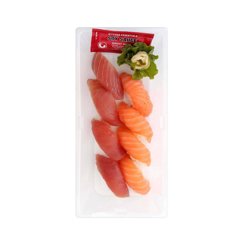 SUSHI RICE (WATER, WHITE RICE, SUSHI VINEGAR (SUGAR, RICE VINEGAR, WATER, SALT, CITRIC ACID, KELP EXTRACT (KELP EXTRACT, SUGAR ALCOHOL, HYDROGENATED STARCH HYDROLYSATES, ALCOHOL, SALT, XANTHAN GUM))), RAW TUNA, RAW SALMON, COOKED SHRIMP NIGIRI (SHRIMP, SALT.), ALBACORE, PICKLED GINGER (GINGER, WATER, SALT, SUGAR, VINEGAR), SCALLIONS, LETTUCE. SOY SAUCE PLEASE SEE POUCH)
