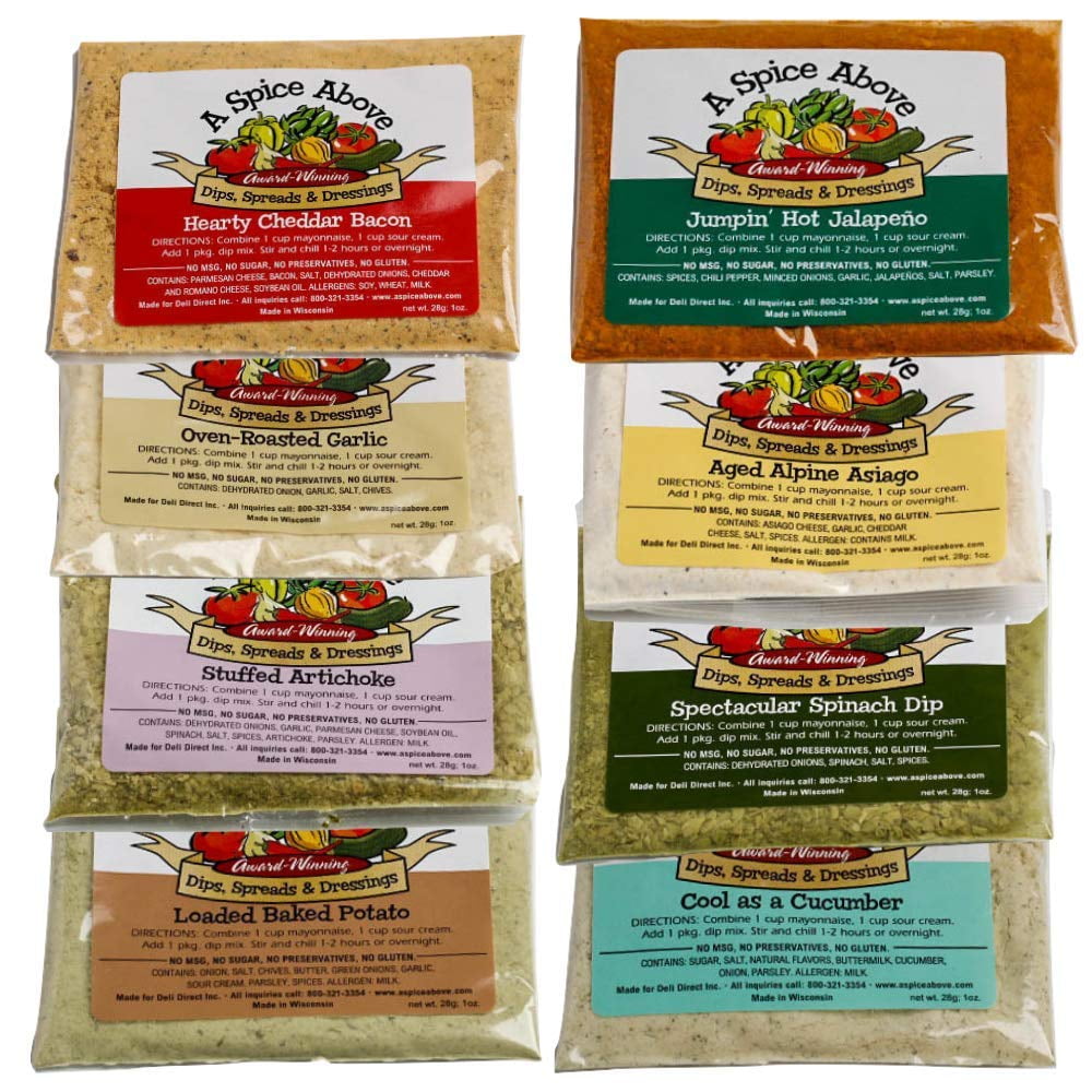 A Spice Above 8 Pack Variety of Dips, Gluten Free, Mixed Seasonings Packets for Easy, Quck-to-Make Appetizer Dips