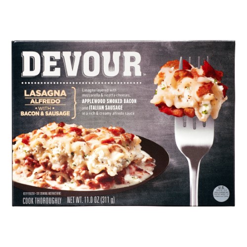 Sauce (Water, Soybean Oil, Parmesan Cheese (Cultured Part-skim Milk, Salt, Enzymes), Modified Food Starch, Cream, Parsley, Milk, Romano And Cheddar Cheese Blend (Cultured Milk, Salt, Enzymes), Spice, Granulated Garlic, Salt, Natural Flavor), Cooked Macaroni Product (Water, Wheat Flour, Dried Egg Whites), Ricotta Cheese Filling (Ricotta Cheese (Whey, Cream, Milk, Vinegar, Carrageenan), Low Moisture Part Skim Mozzarella Cheese (Part Skim Cultured Milk, Salt, Enzymes, Sodium Hexametaphosphate), Water, Cream, Romano Cheese (Cultured Part Skim Milk, Salt, Enzymes, Cellulose), Modified Food Starch, Parsley, Milk, Spices, Xanthan Gum, Granulated Garlic, Guar Gum, Locust Bean Gum), Low Moisture Part Skim Mozzarella Cheese (Part Skim Cultured Milk, Salt, Enzymes, Sodium Hexametaphosphate), Fully Cooked Applewood Smoked Bacon Pieces (Bacon (!Cured With Water, Salt, Sugar, Sodium Nitrite), Applewood Smoke Flavor, !May Contain Sodium Phosphate, Smoke Flavor, Sodium Erythorbate, Sodium Ascorbate, Dextrose), Cooked Italian Sausage Crumbles (Pork, Seasonings (Spices, Salt, Flavoring), Water, Salt, Natural Flavor), Cellulose