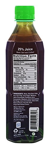 Purified Water, Aloe Vera Juice, Aloe Vera Pulp, Cane Sugar, Mixed Berry Juice (Blueberry Juice, Cranberry Juice, Red Grape Juice, White Grape Juice, Yumberry Juice, Mulberry Juice, Apple Juice), Natural Flavors, Citric Acid, Calcium Lactate, Ascorbic Acid, Grape Skin Extract (Color)