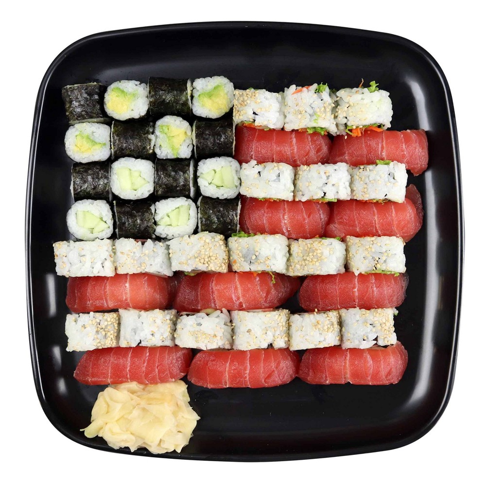 WATER, SROWN RICE, RAW TUNA, AVOCADO, SUSHI VINEGAR (SUGAR, RICE VINEGAR, WATER. SALT, CITRIC ACID, KELP EXTRACT KELP EXTRACT, SORBITOL, MALTITOL, HYDROGENATED STARCH HYDROLYSATES, ALCOHOL, SALT, XANTHAN GUM)), CUCUMBER, PICKLED GINGER (GINGER, WATER, SALT, SUGAR, VINEGAR), CRAPSTICK FISH PROTEIN (ALASKA POLLOCK AND/OR PACIFIC WHITING), WATER, POTATO STARCH, RICE WNE WATER, SUGAR, ALCOHOL, RICE, SALT), SUGAR, EGG WHITE, TAPIOCA STARCH, NATURAL FLAVOR (CRAS), POTASSIUM CHLORIDE, SALT, YEAST EXTRACT, SOY LECITHIN, COLOR ADDED PAPRIKA, TOMATO LYCOPENE)), WASABI WASABI, HORSERADISH, SORBITOL, RAPE SEED, OIL, SALT, NATURAL MUSTARD 014, RED QUINOA CARROTS, GREEN LEAF LETTUCE, SEAWEED, SESAME SEED.