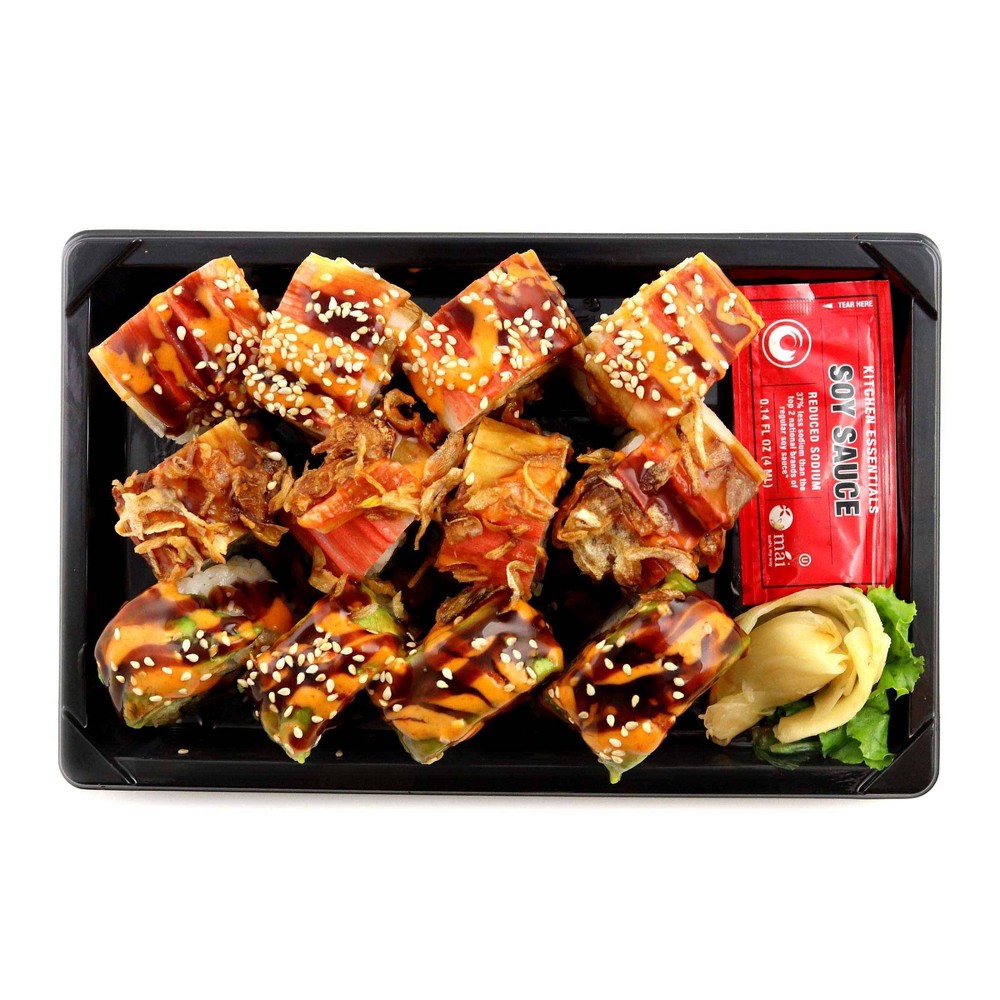 WATER,WHITE RICE,SUSHI VINEGAR (SUGAR,RICE VINEGAR, SALT,CITRIC ACID, KELP EXTRACT (KELP EXTRACT,SORBITOL,MALTITOL,HYDROGENATED STARCH HYDROLYSATES,ALCOHOL,SALT,XANTHAN GUM)), CRABSTICK (FISH PROTEIN (ALASKA POLLOCK&/OR PACIFIC WHITING),SUGAR,POTATO&TAPIOCA STARCH,EGG WHITE,NATURAL FLAVOR(CRAB JUICE),POTASSIUM CHLORIDE,SALT,YEAST EXTRACT,SOY LECITHIN,COLOR ADDED (PAPRIKA, TOMATO LYCOPENE)), AVOCADO, PICKLED GINGER (GINGER,SALT,SUGAR,VINEGAR),SHRIMP TEMPURA (SHRIMP,WHEAT FLOUR,STARCH,EGG ALBUMEN POWDER, SALT,BAKING POWDER,WHOLE EGG POWDER,WHEAT PROTEIN, FOOD COLOR (VITAMIN B2),PALM OIL), VEGAN SPICY MAYO (CANOLA OIL,BROWN RICE SYRUP,APPLE CIDER VINEGAR,SOY PROTEIN,SEA SALT, MUSTARD FLOUR,LEMON JUICE CONCENTRATE),RED CHILI PUREE (JALAPENO,CITRIC ACID),DEXTROSE,SESAME OIL,SOY SAUCE (SOYBEAN,WHEAT, SALT),DISTILLED VINEGAR, SALT,CAYENNE,MODIFIED CORN STARCH,LEMON JUICE CONCENTRATE,RICE VINEGAR,YEAST EXTRACT,CULTURED DEXTROSE,XANTHAN GUM),CREAM CHEESE (PASTEURIZED MILK&CREAM, CHEESE CULTURE, SALT,LOCUST BEAN GUM),TERIYAKI SAUCE (SUGAR,SOY SAUCE,MODIFIED FOOD STARCH,PRUNE CONCENTRATE JUICE,SALTED RICE WINE,LEMON CONCENTRATE JUICE,ONION POWDER,NATURAL FLAVOR,XANTHAN GUM),SESAME SEED,LETTUCE,BBQ SAUCE (SOY SAUCE, SUGAR,DEXTROSE,SALTED SAKE[RICE,KOJI{ASPERGILLUS ORYZAE},SALT],CORN STARCH,CARAMEL COLOR,YEAST EXTRACT,XANTHAN GUM), SEAWEED,FRIED SHALLOT (SHALLOT,SOYBEAN OIL),JALAPENO.