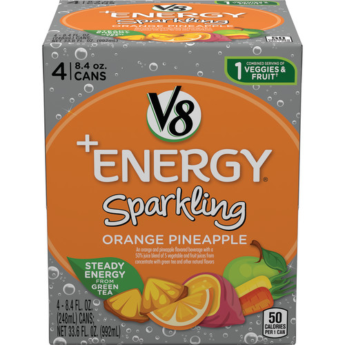 AN ORANGE AND PINEAPPLE FLAVORED SPARKLING BEVERAGE WITH A 50% JUICE BLEND OF 5 VEGETABLE AND FRUIT JUICES FROM CONCENTRATE WITH GREEN TEA, ORANGE PINEAPPLE
