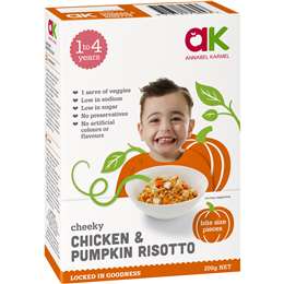 Tomato And Pumpkin Risotto (Water, Cooked Rice (Water, Rice), Vegetables (Onion, Pumpkin), Tomatoes, Tomato Paste, Sundried Tomatoes, Cornflour, Cheese, Apple Juice Concentrate, Cheese Powder, Yeast Extract, Pumpkin Powder, Spices, Herbs), Cooked Chicken, Chicken, Potato Starch, Wheat Fibre, Cornflour, Diced Butternut Pumpkin