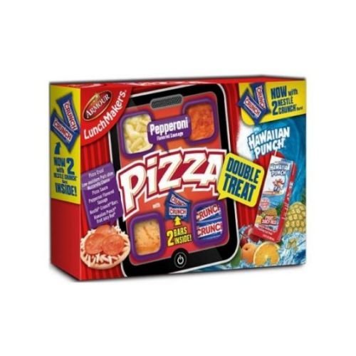 HAWAIIAN PUNCH FRUIT JUICY RED: WATER, HIGH FRUCTOSE CORN SYRUP AND LESS THAN 2% OF: CONCENTRATED JUICES (APPLE, CLARIFIED PINEAPPLE, PASSIONFRUIT, ORANGE), FRUIT PUREES (APRICOT, PAPAYA, GUAVA), ASCORBIC ACID (VITAMIN C), CITRIC ACID, NATURAL AND ARTIFICIAL FLAVORS, PECTIN, ACACIA GUM, ESTER GUM, RED 40, BLUE 1, SUCRALOSE. PIZZA CRUST: ENRICHED BLEACHED WHEAT FLOUR (FLOUR, NIACIN, IRON, THIAMINE MONONITRATE, RIBOFLAVIN, FOLIC ACID), WATER, VEGETABLE SHORTENING (INTERESTERIFIED SOYBEAN OIL, HYDROGENATED SOYBEAN OIL), CONTAINS 2% OR LESS OF YEAST, SUGAR, SALT, CALCIUM PROPIONATE, MONOGLYCERIDES, VEGETABLE GUMS (CORN STARCH, GUAR GUM, XANTHAN GUM). NESTLE CRUNCH BARS: MILK CHOCOLATE (SUGAR, CHOCOLATE, COCOA BUTTER, NONFAT MILK, MILKFAT, LACTOSE, SOY LECITHIN, VANILLIN - AN ARTIFICIAL FLAVOR), CRISPED RICE (RICE FLOUR, SUGAR, BARLEY MALT, SALT). LOW-MOISTURE PART-SKIM MOZZARELLA CHEESE: CULTURED PASTEURIZED PART-SKIM MILK, SALT, ENZYMES, POTATO STARCH AND POWDERED CELLULOSE (TO PREVENT CAKING), NATAMYCIN (MOLD INHIBITOR). PIZZA SAUCE: WATER, TOMATO PASTE, HIGH FRUCTOSE CORN SYRUP, MODIFIED FOOD STARCH, SALT, SPICES, CITRIC ACID, SODIUM BENZOATE AND POTASSIUM SORBATE (PRESERVATIVES), GARLIC POWDER, POTASSIUM CHLORIDE, ONION POWDER, NATURAL FLAVOR. PEPPERONI FLAVORED SAUSAGE: PORK, MECHANICALLY SEPARATED TURKEY, WATER, CORN SYRUP, PEPPERONI (PORK, BEEF, SALT, CONTAINS 2% OR LESS OF DEXTROSE, NATURAL FLAVORS, OLEORESIN OF PAPRIKA, LACTIC ACID STARTER CULTURE, DEHYDRATED GRANULATED GARLIC, SODIUM NITRITE, BHA, BHT, CITRIC ACID), SALT, CONTAINS 2% OR LESS OF BEEF, DEXTROSE, OLEORESIN OF PAPRIKA, FLAVORINGS, MODIFIED FOOD STARCH, POTASSIUM LACTATE, SMOKE FLAVORING, SODIUM DIACETATE, SODIUM ERYTHORBATE, SODIUM NITRITE, BHA, BHT, CITRIC ACID.
