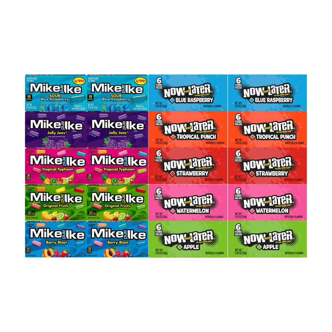 Assorted Candy Mix Variety Pack – 5 Flavors of Mike and Ike & 5 Flavors of Now and Later – 2 Each Flavor – Bulk Candy for Parties, Snacks, Office, Gift Bags – Individually Wrapped – 20 Pack