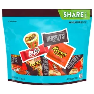 Hershey's Milk Chocolate: Milk Chocolate [Sugar; Milk; Cocoa Butter; Chocolate; Milk Fat, Lecithin (Soy) Natural Flavor]. Kit Kat Wafer Bars: Sugar, Wheat Flour, Skim Milk, Cocoa Butter, Chocolate, Vegetable Oil [Palm Kernel Oil, Palm Oil], Milk Fat, Lactose (Milk), Contains 2% Or Less Of: Lecithin (Soy), Pgpr, Vanillin, Artificial Flavor, Salt, Yeast, Baking Soda. Reese's Peanut Butter Cups: Milk Chocolate [Sugar, Cocoa Butter, Chocolate, Skim Milk, Milk Fat, Lactose, Lecithin (Soy), Pgpr], Peanuts, Sugar, Dextrose, Salt, Tbhq And Citric Acid, To Maintain Freshness. Reese's Pieces Candy: Sugar, Partially Defatted Peanuts, Hydrogenated Vegetable Oil [Palm Kernel Oil; Soybean Oil]; Corn Syrup Solids, Dextrose; Contains 2% Or Less Of: Corn Syrup; Palm Kernel Oil; Salt; Confectioner's Glaze, Modified Cornstarch; Lecithin (Soy), Artificial Color [Yellow 6 Lake, Yellow 5 Lake, Red 40 Lake, Blue 1 Lake], Vanillin, Artificial Flavor, Carnauba Wax, Milk.