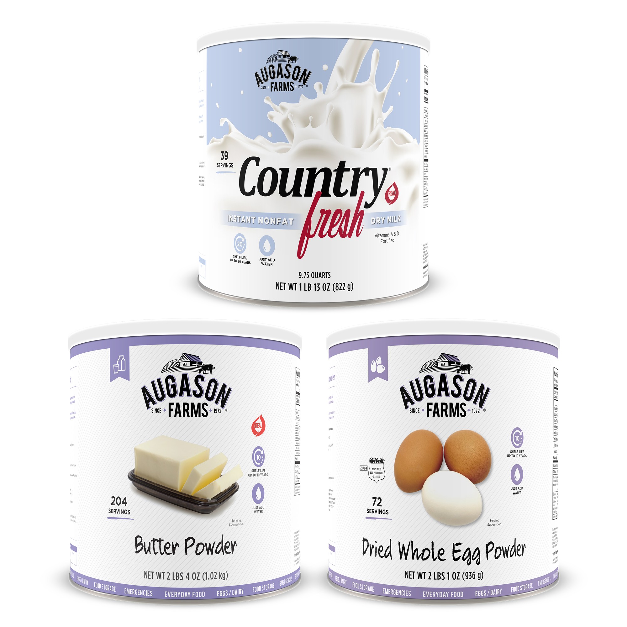 Country Fresh 100% Instant Nonfat Dry Milk: Nonfat Dry Milk, Vitamin A Palmitate, Vitamin D3,,br,butter Powder: Butter (Cream, Water, Salt), Nonfat Milk, Tocopherols, Ascorbyl Palmitate,,br,whole Eggs: Whole Eggs, Sodium Silicoaluminate (As An Anticaking Agent)