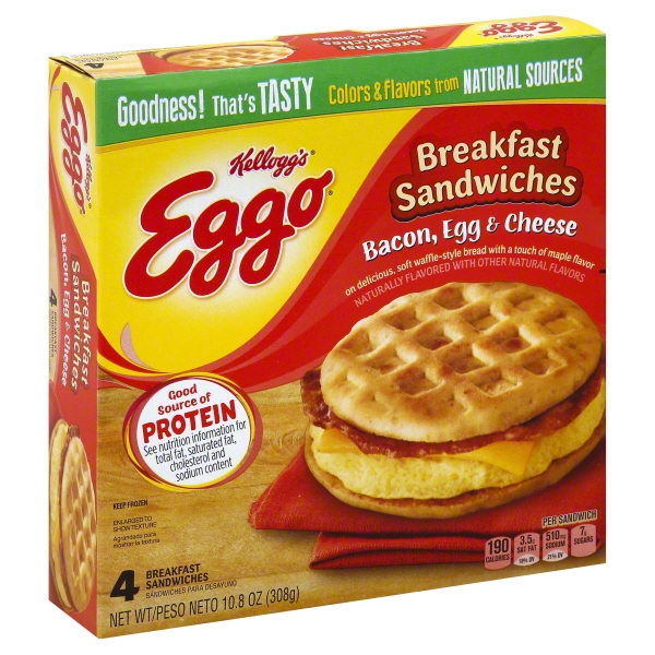 Waffle Style Bread (Whole Wheat Flour, Enriched Flour (Wheat Flour, Malted Barley Flour, Niacin, Reduced Iron, Vitamin B1 (Thiamin Mononitrate), Vitamin B2 (Riboflavin), Folic Acid), Sugar, Water, Soybean Oil, Yeast, Wheat Starch, Yellow Corn Flour, Salt, Modified Corn Starch, Nonfat Milk, Buttermilk Solids, Natural Flavor, Dough Conditioner (Isolated Soy Protein, Mono And Diglycerides, Modified Cellulose, Salt, Soybean Oil, Soy Lecithin), Dried Molasses, Natural And Artificial Maple Flavor, Fructose, Carrot Juice For Color, Pumpkin Juice For Color), Scrambled Egg Patty (Whole Eggs, Whey, Egg Whites, Nonfat Milk, Soybean Oil, Modified Food Starch, Dicalcium Phosphate, Salt, Sodium Bicarbonate, Xanthan Gum, Guar Gum, Citric Acid , Pepper), Fully Cooked Bacon (Fresh Pork Bellies Cured With Water, Salt, Sugar, Artificial Smoke Flavor, Sodium Phosphate, Sodium Erythorbate, Sodium Nitrite), Pasteurized Process Cheese (Cheddar Cheese (Cultured Milk, Salt, Enzymes), Water, Cream, Sodium Phosphates, Salt, Annatto Extract For Color, Paprika Extract For Color, Enzymes)