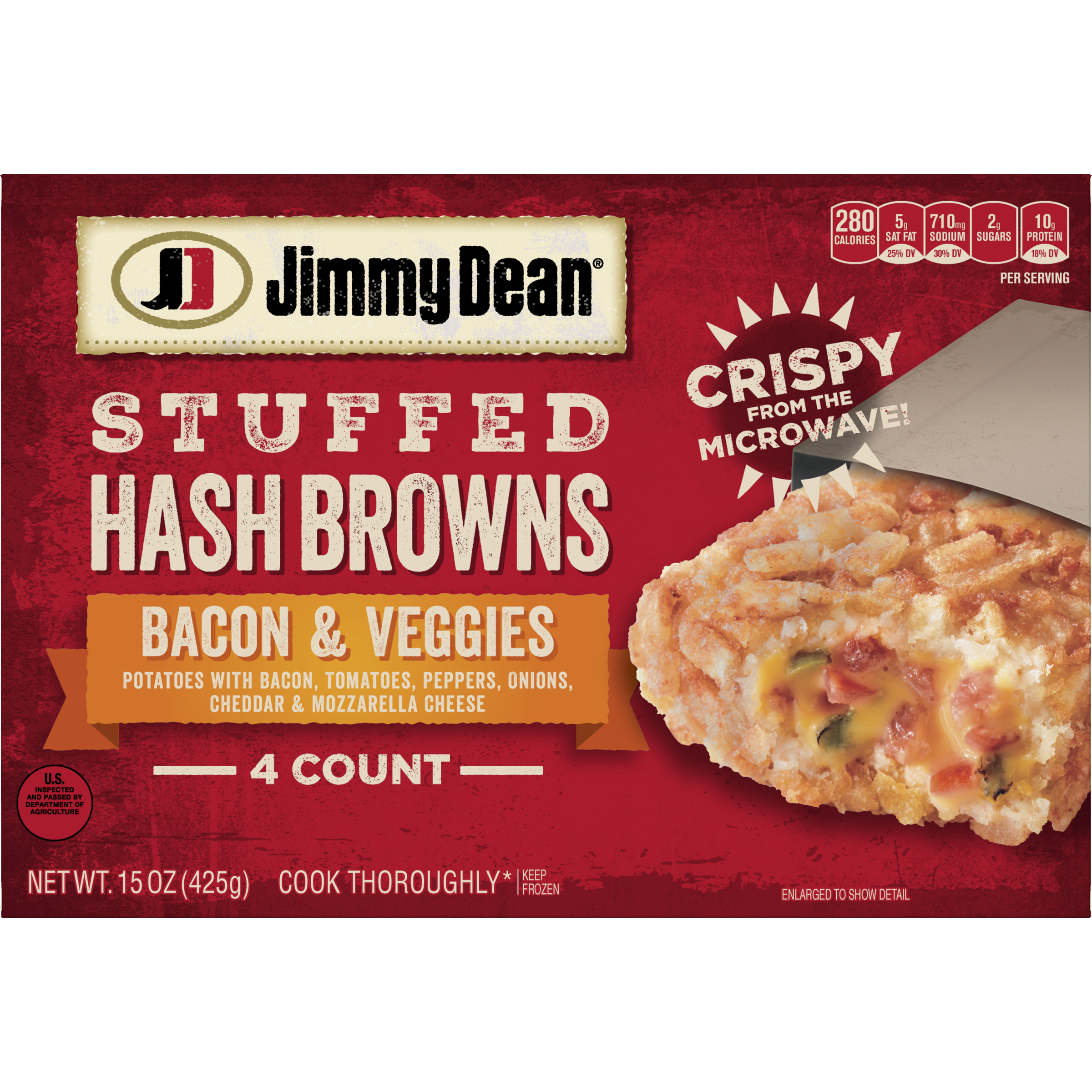 BACON & VEGGIES POTATOES WITH BACON, TOMATOES, PEPPERS, ONIONS, CHEDDAR & MOZZARELLA CHEESE STUFFED HASH BROWNS, BACON & VEGGIES