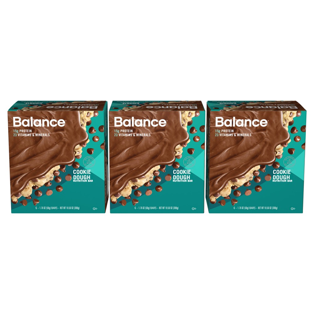 Balance Bar, Healthy Protein Snacks, Cookie Dough, 1.76 oz, Pack of Three 6-Count Boxes
