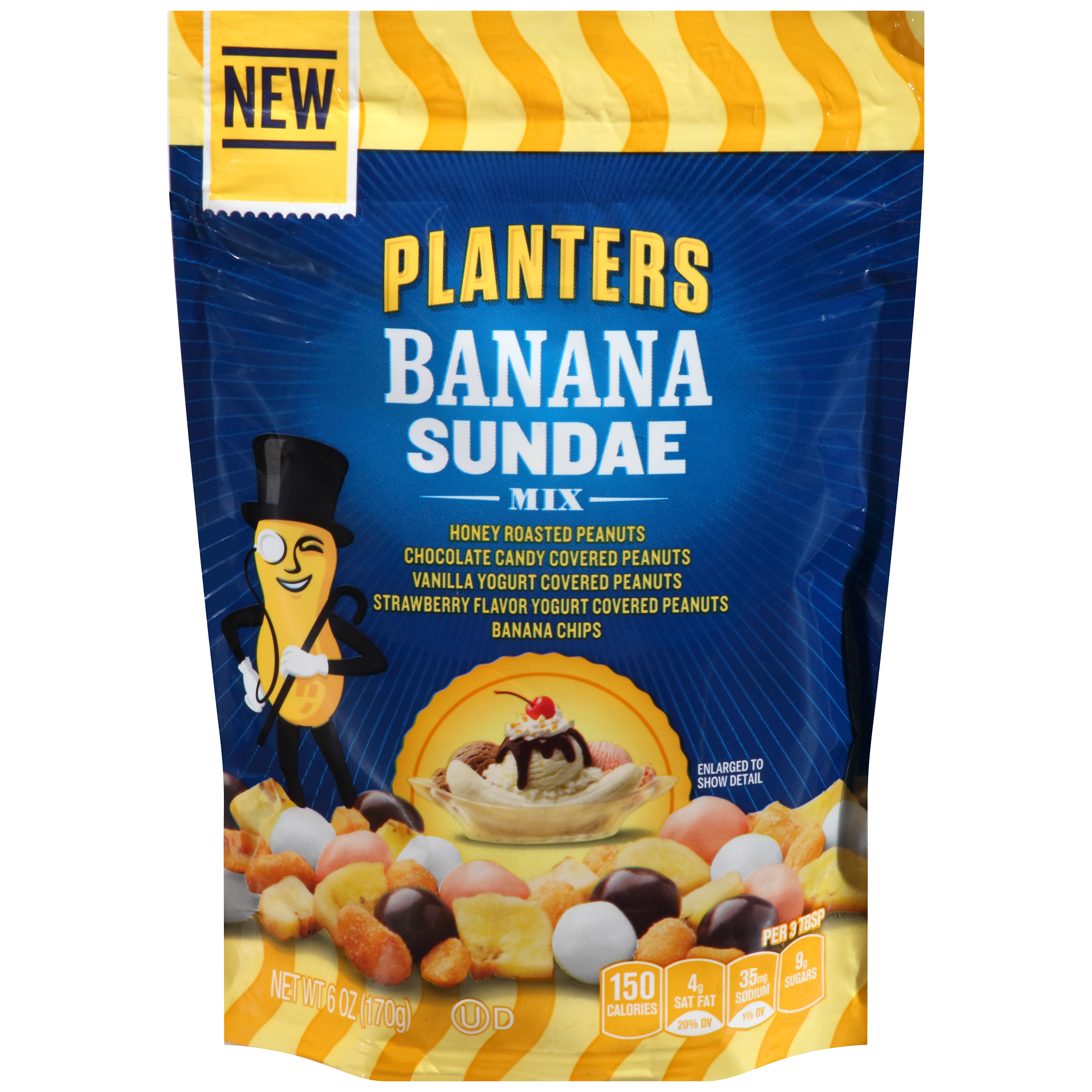 BANANA SUNDAE HONEY ROASTED PEANUTS CHOCOLATE CANDY COVERED PEANUTS VANILLA YOGURT COVERED PEANUTS STRAWBERRY FLAVOR YOGURT COVERED PEANUTS BANANA CHIPS MIX, BANANA SUNDAE
