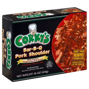 Pork Shoulder, Corky's Original Bar-B-Q Sauce (Water, Tomato Paste, High Fructose Corn Syrup, Molasses, Distilled Vinegar, Brown Sugar, Salt, Worcestershire Sauce (Distilled Vinegar, Molasses, Corn Syrup, Water, Salt, Caramel Color, Garlic Powder, Sugar, Spices, Tamarind, Natural Flavors), Cayenne Peppers, Natural Smoke Flavor, Dehydrated Onions, Soybean Oil, Dextrose, Dehydrated Garlic, Spice And Spice Extractives, Xanthan Gum, Sodium Benzoate, (Preservative), Guar Gum, Ascorbic Acid).
