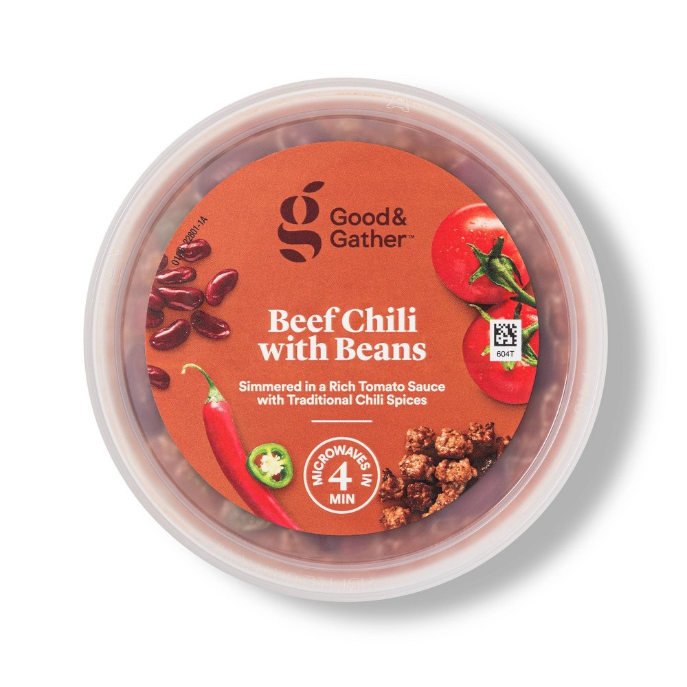 TOMATOES, GROUND BEEF, COOKED DARK RED KIDNEY BEANS, ONIONS, GREEN BELL PEPPERS, RED BELL PEPPERS, WATER, CONTAINS 2% OR LESS OF: BEEF BASE (ROASTED BEEF, SALT, SUGAR, DEXTROSE, CORN OIL, BEEF STOCK, DRIED WHEY, MALTODEXTRIN, CARAMEL COLOR, NATURAL FLAVOR), TOMATO PASTE, ORGANIC CANOLA OIL, GARLIC, MODIFIED CORN STARCH, JALAPENO PEPPERS, SALT, GARLIC POWDER, LIME JUICE, HOT PEPPER SAUCE (DISTILLED VINEGAR, RED PEPPER, SALT), CILANTRO, NISIN PREPARATION AND SPICES.