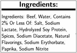 BEEF, WATER, CONTAINS 2% OR LESS OF: SALT, SODIUM LACTATE, HYDROLYZED SOY PROTEIN, SPICES, SODIUM DIACETATE, NATURAL FLAVORINGS, SODIUM ERYTHORBATE, PAPRIKA, SODIUM NITRITE.