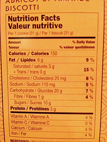 UNBLEACHED FLOUR (WHEAT FLOUR, MALTED BARLEY FLOUR, NIACIN, IRON, THIAMINE MONONITRATE, RIBOFLAVIN, FOLIC ACID), SUGAR, UNSALTED BUTTER (CREAM), EGGS, DRIED APRICOT (APRICOTS, RICE FLOUR, SULPHUR DIOXIDE (TO RETAIN COLOR), ALMONDS, WHITE CHOCOLATE (SUGAR, UNSWEETENED CHOCOLATE, COCOA BUTTER, SOY LECITHIN [EMULSIFIER], VANILLA), CONTAINS LESS THAN 2% REDUCED SODIUM BAKING POWDER (CALCIUM ACID PYROPHOSPHATE, CORN STARCH, SODIUM BICARBONATE, POTASSIUM BICARBONATE, MONOCALCIUM PHOSPHATE), ORANGE PEEL, NATURAL FLAVOURS, SALT, VANILLA EXTRACT.