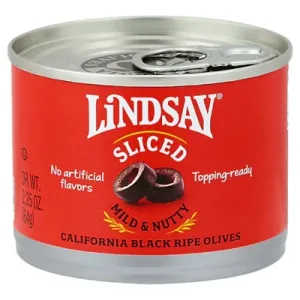 Lindsay's black ripe olives sliced mild nutty black ripe olives are a plump and flavorful pantry staple. Bursting with flavor, these olives are perfect for a variety of dishes, from pasta salads to pizza toppings. Each order includes 12 6oz cans of Lindsay medium pitted black ripe olives. These olives are Non-GMO, gluten-free, cholesterol-free, and contain no artificial colors or flavors. They are also packaged in BPA-free lining, ensuring the highest quality. Unfortunately, there is no information available about what people say about the product.