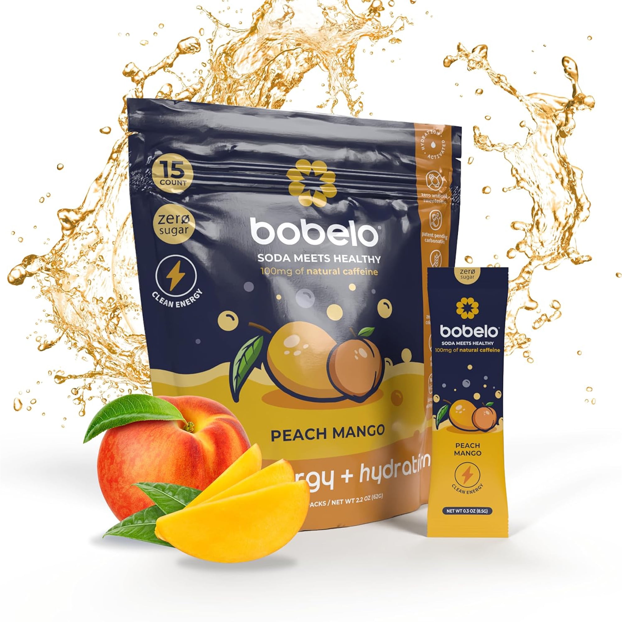 Bobelo Peach Mango Powdered Energy Drink Mix with 100mg Caffeine, 15 Servings, 0.3 oz