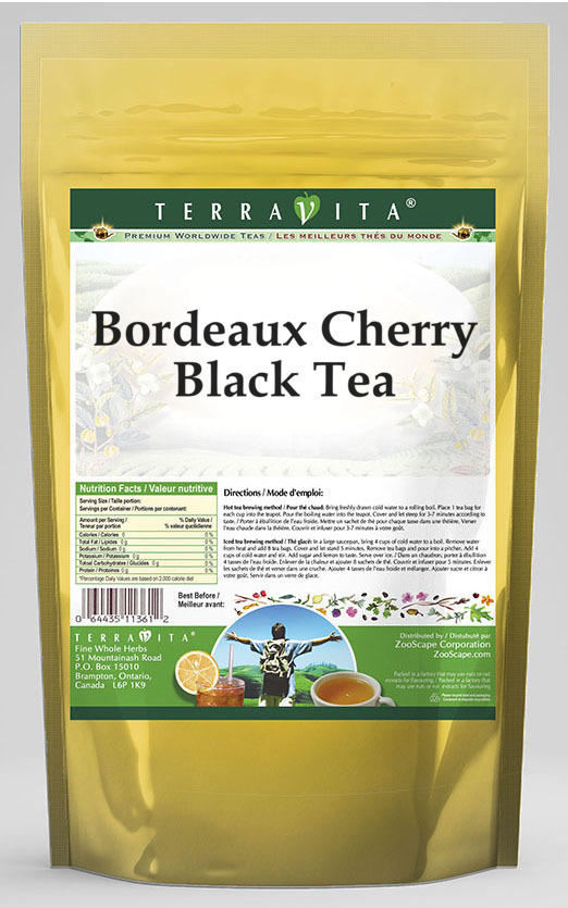Black Tea, Cherries (Dried), Chocolate Drops, Cocoa Bean Nibs, Natural Flavors