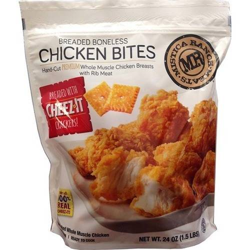 CHICKEN BREAST WITH RIB MEAT, WATER, SALT, SODIUM PHOSPHATES. BATTERED WITH: WATER, WHEAT FLOUR, CONTAINS LESS THAN 2% OF THE FOLLOWING: CHEDDAR CHEESE [PASTEURIZED MILK, CHEESE CULTURE, SALT, ENZYME], YELLOW CORN FLOUR, SALT, UNSALTED BUTTER [PASTEURIZED CREAM, NATURAL FLAVORS], WHEY, BUTTERMILK SOLIDS, MALTODEXTRIN, MODIFIED FOOD STARCH, LEAVENING [SODIUM ACID PYROPHOSPHATE, SODIUM BICARBONATE], NATURAL FLAVOR, LACTIC ACID, EXTRACTIVES OF PAPRIKA, TURMERIC AND ANNATTO. BREADED WITH CHEEZ-IT CRACKERS: CHEEZ-IT CRACKERS (ENRICHED FLOUR [WHEAT FLOUR, NIACIN, REDUCED IRON, THIAMIN MONONITRATE (VITAMIN B1), FOLIC ACID], VEGETABLE OIL [SOYBEAN AND PALM OIL WITH TBHQ FOR FRESHNESS], CHEESE MADE WITH SKIM MILK [SKIM MILK, WHEY PROTEIN, CHEESE CULTURES, SALT, ENZYMES, ANNATTO EXTRACT FOR COLOR], CONTAINS TWO PERCENT OR LESS OF SALT, PAPRIKA, YEAST, PAPRIKA OLEORESIN FOR COLOR, SOY LECITHIN). BREADING SET IN SOYBEAN OIL.