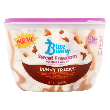BUNNY TRACKS VANILLA FLAVORED REDUCED FAT ICE CREAM, CHOCOLATY PEANUT BUTTER BUNNIES, CHOCOLATY COVERED PEANUTS, CARAMEL AND FUDGE SWIRLS, BUNNY TRACKS