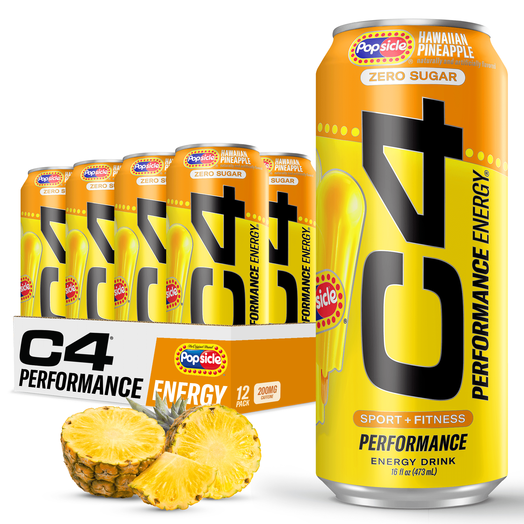 C4 Performance Energy Drink, Hawaiian Pineapple Popsicle Flavor, Zero Sugar, Carbonated, 16 oz can (12 Pack)