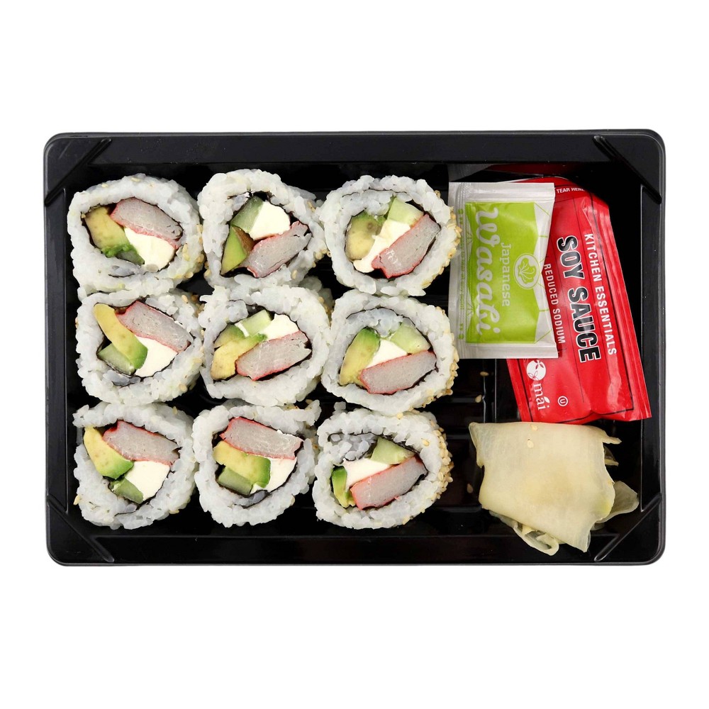 WATER, CRABSTICK (FISH PROTEIN (ALASKA POLLOCK AND/OR PACIFIC WHITING), WATER, POTATO STARCH, RICE WINE (WATER, SUGAR, ALCOHOL, RICE, SALT), SUGAR, EGG WHITE, TAPIOCA STARCH, NATURAL FLAVOR (CRAB), POTASSIUM CHLORIDE, SALT, YEAST EXTRACT, SOY LECITHIN, COLOR ADDED (PAPRIKA, TOMATO LYCOPENE)), AVOCADO, CREAM CHEESE (PASTEURIZED MILK AND CREAM, CHEESE CULTURE, SALT, ORGANIC LOCUST BEAN GUM), BROWN RICE, SUSHI VINEGAR (SUGAR, RICE VINEGAR, WATER, SALT, CITRIC ACID, KELP EXTRACT (KELP EXTRACT, SORBITOL, MALTITOL, HYDROGENATED STARCH HYDROLYSATES, ALCOHOL, SALT, XANTHAN GUM)), CUCUMBER, PICKLED GINGER (GINGER, WATER, SALT, SUGAR, VINEGAR), RED QUINOA, WASABI (WASABI, HORSERADISH, SORBITOL, RAPESEED, OIL, SALT, NATURAL MUSTARD OIL), SESAME SEED, SEAWEED.