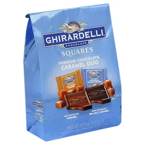 CARAMEL DUO PREMIUM CHOCOLATE SQUARES, MILK CHOCOLATE CARAMEL, DARK CHOCOLATE SEA SALT CARAMEL