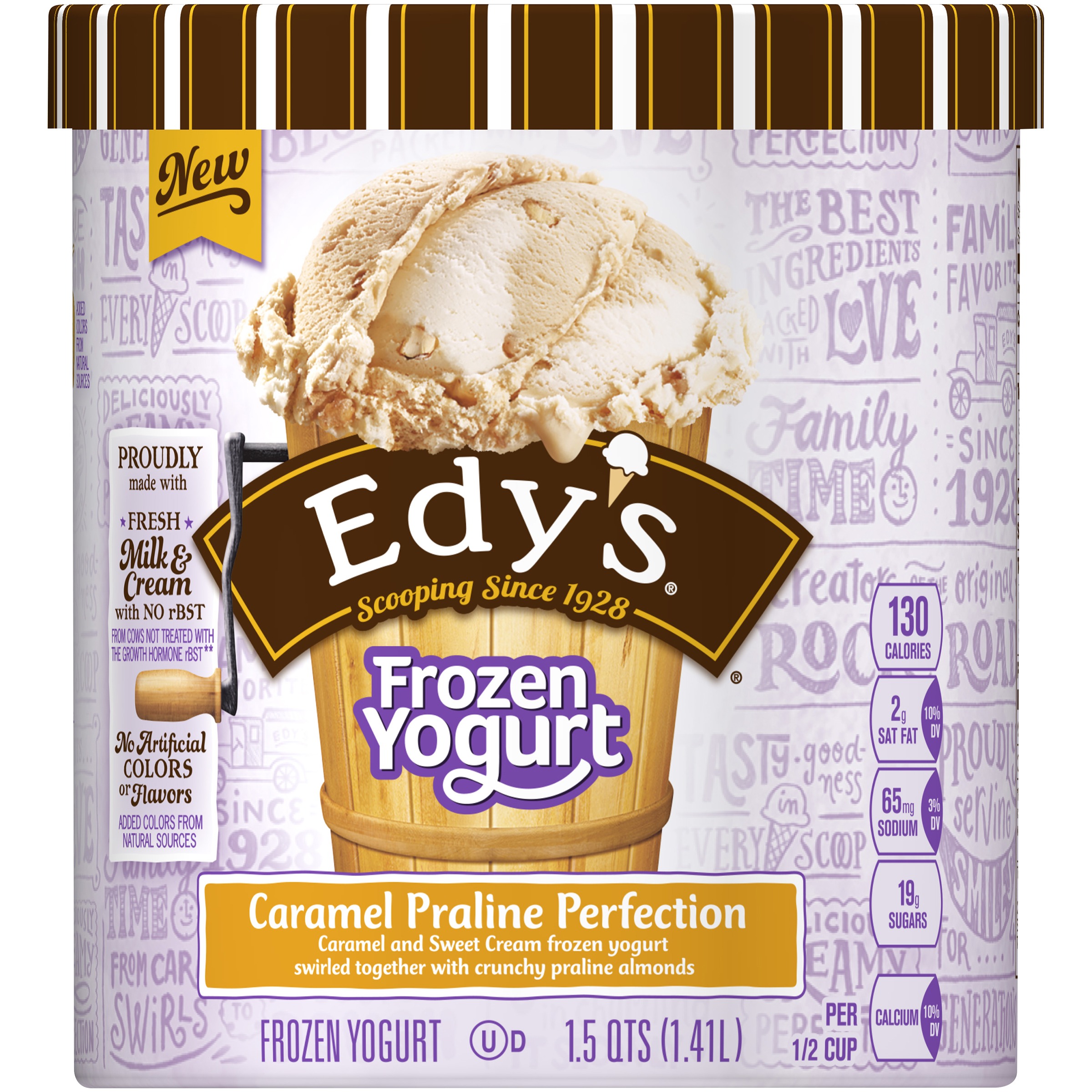 CARAMEL PRALINE PERFECTION CARAMEL AND SWEET CREAM FROZEN YOGURT SWIRLED TOGETHER WITH CRUNCHY PRALINE ALMONDS, CARAMEL PRALINE PERFECTION