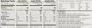 TABLE WATER ORIGINAL: INGREDIENTS: ENRICHED FLOUR (WHEAT FLOUR, CALCIUM, NIACIN, IRON, THIAMIN MONONITRATE [VITAMIN B1], RIBOFLAVIN [VITAMIN B2], FOLIC ACID), PALM OIL, SALT. CONTAINS WHEAT. MAY CONTAIN MILK, SOY, OTHER SOURCES OF GLUTEN (BARLEY, RYE, OAT), AND SESAME. TABLE WATER CRACKED BLACK PEPPER: INGREDIENTS: ENRICHED FLOUR (WHEAT FLOUR, CALCIUM, NIACIN, IRON, THIAMIN MONONITRATE [VITAMIN B1], RIBOFLAVIN [VITAMIN B2), FOLIC ACID), PALM OIL, SALT, BLACK PEPPER. CONTAINS WHEAT. MAY CONTAIN MILK, SOY, SESAME, AND OTHER SOURCES OF GLUTEN (BARLEY, RYE AND OAT). TABLE WATER TOASTED SESAME: INGREDIENTS: ENRICHED FLOUR (WHEAT FLOUR, CALCIUM, NIACIN, IRON, THIAMIN MONONITRATE (VITAMIN B1], RIBOFLAVIN (VITAMIN B2), FOLIC ACID), PALM OIL, SESAME SEEDS, SALT. CONTAINS WHEAT AND SESAME. MAY CONTAIN MILK, SOY, AND OTHER SOURCE OF GLUTEN (BARLEY, RYE AND OAT).