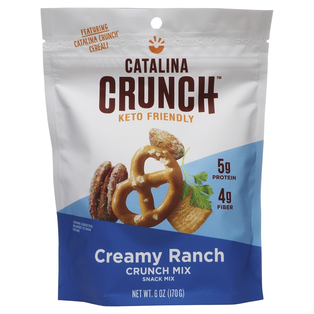 Calories, Total Fat, Sodium, Total Carbohydrate, Protein, Pecans, Catalina Crunch Cereal (pea Protein, Tapioca Starch, Potato Fiber, Corn Fiber, Inulin Fiber, Baking Powder, Guar Gum, Calcium Carbonate, Caramel Color), Almonds, Chickpea Pretzels (chickpea Flour, Potato Flour, Cornstarch, Rice Flour, Tapioca Starch, Sea Salt, Cane Sugar, High Oleic Sunflower Oil, Pea Protein, Sunflower Lecithin, Xanthan Gum, Yeast, Citric Acid), High Oleic Sunflower Oil, Ranch Seasoning (buttermilk, Salt, Spices, Yeast Extract, Sour Cream, Whey, Natural Flavor, Blue Cheese [milk, Salt, Cultures, Enzymes], Lactic Acid, Vinegar). Contains: Milk, Almonds, Pecans. Processed In A Facility That Processes Peanuts, Milk And Tree Nuts.