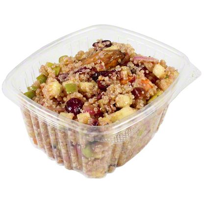 quinoa with sweet potatoes and apples (water, sweet potato, granny smith apples, quinoa, apple cider vinaigrette (extra virgin olive oil, apple cider vinegar (apple juice, water), kosher salt, black pepper), red onions, arugula, kale, cranberries (cranberries, sugar, sunflower oil), extra virgin olive oil, parsley, kosher salt, black pepper, cinnamon), contains a bioengineered food ingredient, ***BEST SERVED COLD***, ***KEEP REFRIGERATED***