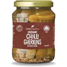Cucumbers*, Herb Infused Vinegar* (White Vinegar*, Herbs Extract*) Natural Sea Salt, Dill*, Onions*, Capsicum*, Mustard Seed*, Chilli*, Coriander*, Pepper*, Stabiliser (Calcium Citrate). (*Certified Organic).