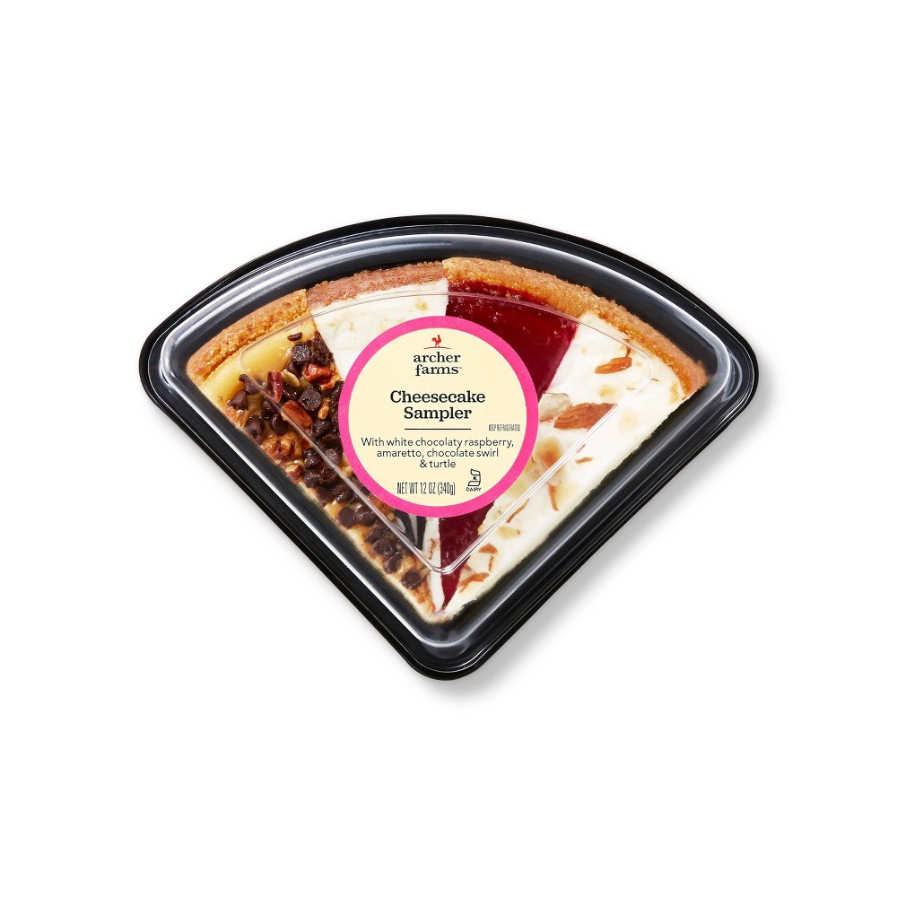 CHEESECAKE SAMPLER WITH WHITE CHOCOLATY RASPBERRY, AMARETTO, CHOCOLATE SWIRL & TURTLE, CHEESESCAKE SAMPLER
