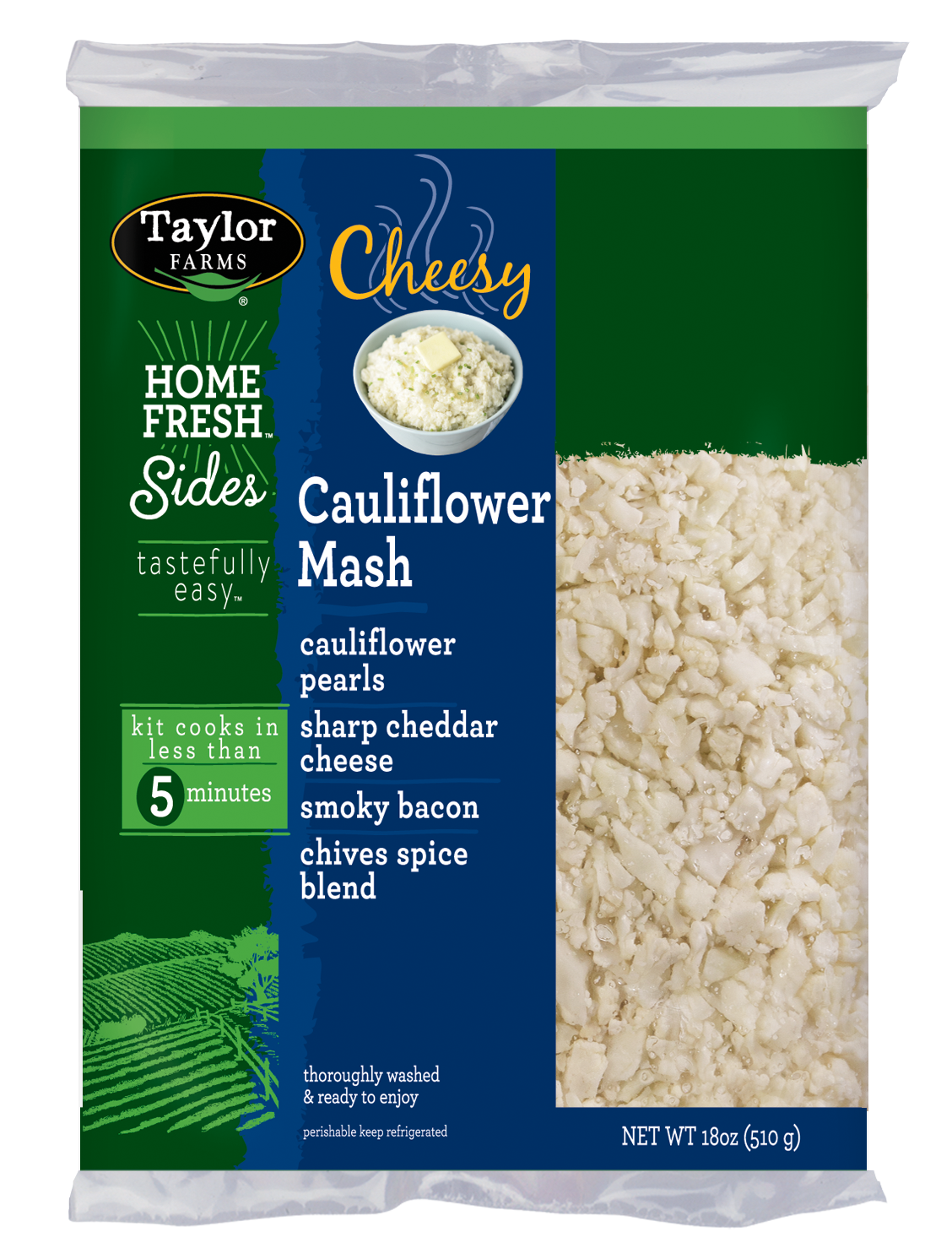 CAULIFLOWER, CHEDDAR CHEESE (CHEDDAR CHEESE [PASTEURIZED MILK, CHEESE CULTURE, SALT, ENZYMES, ANNATTO {VEGETABLE COLOR}], POWDERED CELLULOSE [TO PREVENT CAKING]), BACON TOPPING (BACON CURED WITH: WATER, SALT, SUGAR, SODIUM ERYTHORBATE AND/OR SODIUM ASCORBATE, SODIUM NITRITE. MAY CONTAIN NATURAL SMOKE FLAVORING, SODIUM PHOSPHATE), SALT AND PEPPER WITH CHIVES (SALT, MALTODEXTRIN, DEHYDRATED GARLIC, BLACK PEPPER, DEHYDRATED CHIVES, EXPELLER PRESSED SUNFLOWER OIL [AS A PROCESSING AID], NOT MORE THAN 2% SILICON DIOXIDE ADDED TO PREVENT CAKING).