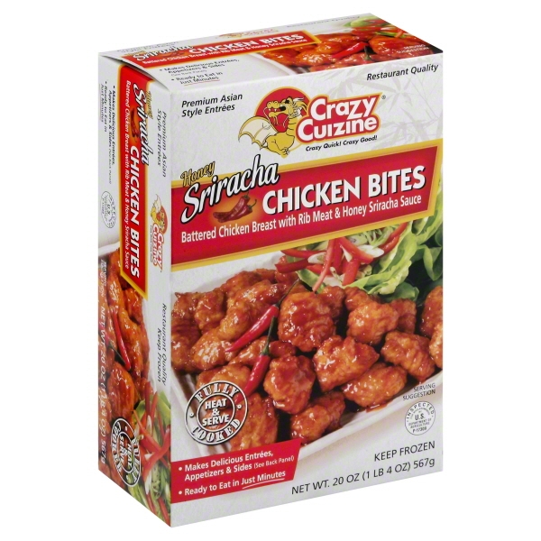 CHICKEN: BREAST MEAT CHICKEN WITH RIB MEAT. WATER, UNBLEACHED ENRICHED WHEAT FLOUR (NIACIN, REDUCED IRON, THIAMINE MONONITRATE, RIBOFLAVIN, FOLIC ACID), SOYBEAN OIL, CORNSTARCH AND CONTAINS LESS THAN 2% OF: MODIFIED FOOD STARCH, SALT, ISOLATED SOY PROTEIN, POTASSIUM CARBONATE, DEXTROSE, EGGS, SPICES, WHEY SOLIDS, CARRAGEENAN, TRICALCIUM PHOSPHATE, SODIUM BICARBONATE. SAUCE: SUGAR, WATER, CANOLA OIL, RED CHILI PUREE (RED JALAPENO PEPPERS, SALT, ACETIC ACID), HONEY, SOY SAUCE (WATER, WHEAT, SOYBEANS, SALT), MODIFIED FOOD STARCH, RICE VINEGAR (WATER, RICE), UNSALTED BUTTER, GARLIC POWDER. XANTHAN GUM.