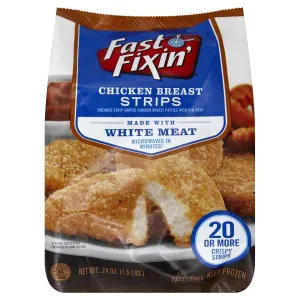 CHICKEN BREAST STRIPS, BREADED STRIP CHICKEN BREAST PATTIES WITH RIB MEAT, MADE WITH WHITE MEAT