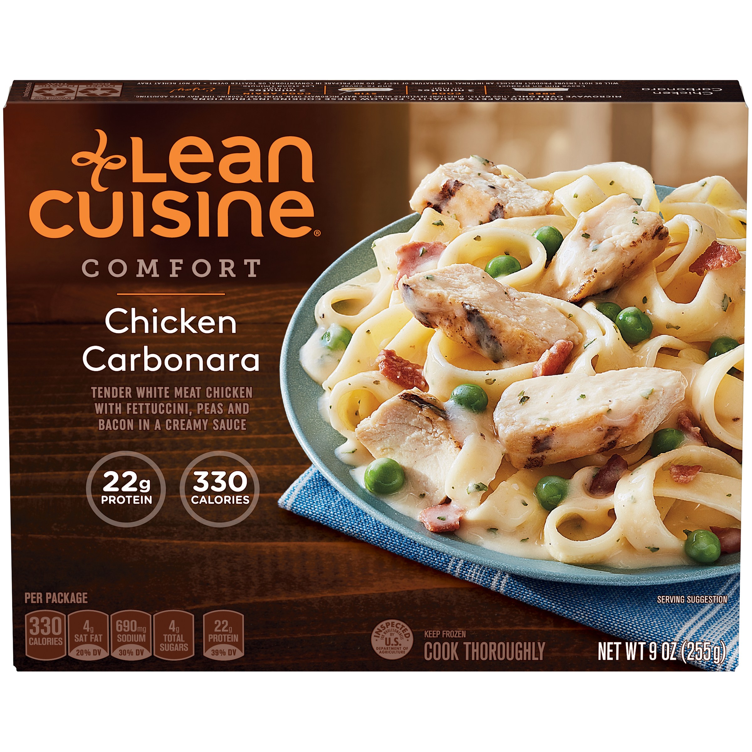 CHICKEN CARBONARA TENDER WHITE MEAT CHICKEN WITH FETTUCCINI, PEAS AND BACON IN A CREAMY SAUCE, CHICKEN CARBONARA
