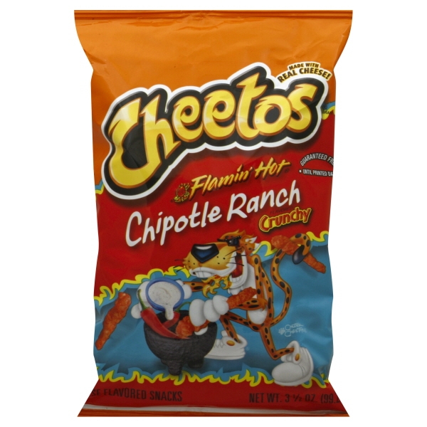 Enriched Corn Meal (Corn Meal, Ferrous Sulfate, Niacin, Thiamin Mononitrate, Riboflavin, Folic Acid), Vegetable Oil (Corn, Canola, Sunflower Oil), Flamin' Hot Chipotle Ranch Seasoning (Salt, Skim Milk, Maltodextrin (Made From Corn), Spices, Buttermilk, Monosodium Glutamate, Onion Powder, Tomato Powder, Artificial Color (Red 40 Lake, Yellow 6 Lake, Yellow 6, Yellow 5), Cheddar Cheese (Milk, Cheese Cultures, Salt, Enzymes), Dextrose, Sunflower Oil, Garlic Powder, Whey, Natural And Artificial Flavor, Lactose, Citric Acid, Romano Cheese (Part-skim Cow's Milk, Cheese Cultures, Salt, Enzymes), Whey Protein Concentrate, And Yeast Extract)