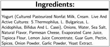 YOGURT (CULTURED PASTEURIZED NONFAT MILK, CREAM), ONION, WATER, SEA SALT, EVAPORATED CANE SUGAR, PARMESAN CHEESE (CULTURED PASTEURIZED PART-SKIM MILK, SALT, ENZYMES), TAPIOCA FLOUR, LEMON JUICE CONCENTRATE, FRUIT PECTIN, GUAR GUM, NATURAL FLAVOR, BLACK PEPPER, NATURAL SMOKE FLAVOR, YEAST EXTRACT, ONION POWDER, GARLIC POWDER. CONTAINS LIVE AND ACTIVE CULTURES: S. THERMOPHILUS, L. BULGARICUS, L. ACIDOPHILUS, BIFIDUS AND L. CASEI.