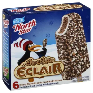 CHOCOLATE ECLAIR CREAMY CENTER IN VANILLA ICE CREAM COATED WITH CAKE CRUNCH BARS, CHOCOLATE ECLAIR
