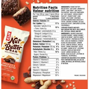 ORGANIC PEANUT BUTTER, ORGANIC ROLLED OATS, ORGANIC BROWN RICE SYRUP, ORGANIC OAT FLOUR, ORGANIC CANE SYRUP, ORGANIC DATE PASTE, ORGANIC PEA PROTEIN, ORGANIC HIGH-OLEIC SUNFLOWER OIL, ORGANIC RICE STARCH, ORGANIC TAPIOCA SYRUP, ORGANIC PALM OIL, ORGANIC PEANUT FLOUR, ORGANIC DRIED CANE SYRUP, ORGANIC RICE FLOUR, VEGETABLE GLYCERIN, ORGANIC UNSWEETENED CHOCOLATE, ORGANIC BROWN RICE PROTEIN, ORGANIC COCOA, NATURAL FLAVOURS, SEA SALT, ORGANIC ALKALIZED COCOA, SUNFLOWER LECITHIN, TOCOPHEROLS. CONTAINS PEANUTS AND OATS. MAY CONTAIN SOY, WHEAT, TRITICALE, BARLEY, RYE, TREE NUTS, AND TRACES OF MILK.