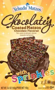 COATED MATZO: WHEAT FLOUR, SUGAR, PALM OIL, COCOA POWDER, WATER, ARTIFICIAL VANILLA FLAVOR. SPRINKLES: SUGAR, TAPIOCA STARCH, ARTIFICIAL FD&C FOOD COLORS (YELLOW #5, YELLOW #6, RED #3, RED #40 AND BLUE #1).
