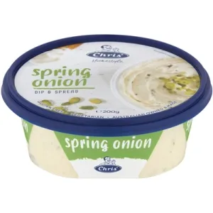 Smooth, creamy dip offering a fresh, mild spring onion flavor and a soft, spreadable texture. Commonly used for chips, vegetable crudités, sandwiches, jacket potatoes and as a party platter accompaniment. Customer reviews often note consistent creaminess and versatile use, with occasional comments about a pronounced onion bite and shareable size.