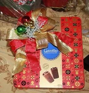 Christmas Gavottes Tin Filled with Assorted Gavottes Crispy Lace Crepes Dentelle From France - Wrapped in Fancy Christmas Decoration - 420 grams - Red or Gold